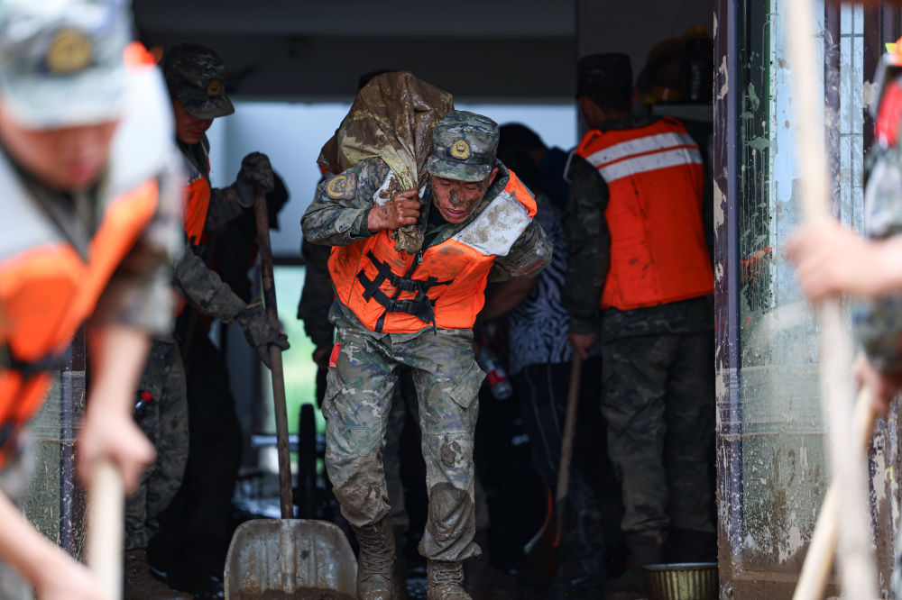 记者8日在救援现场看到,救援人员两人一组用绳子将彼此连接,背着铁锹蹚过泥水。他们背起受灾群众,将其转移至安全地带,有的推车清理淤泥,为后续救援开辟道路。