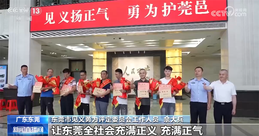 东莞市见义勇为评定委员会工作人员佘大兵称:“在面对人民群众生命财产安全受到威胁的时候挺身而出,感动了全市人民,这种见义勇为的行为让东莞全社会充满正义、充满正气。”