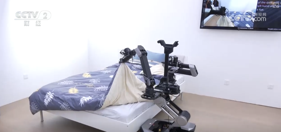 这是一台具身智能的机器人,正在对卧室床铺的被子做整理和叠放。它是通过视觉识别后,完全自主完成操作。工作人员介绍,2025年,这样类似的具身智能机器人,上半年出货量就超过了百台。其中,有近一半就是销往海外,用于大模型的数据采集和研发。