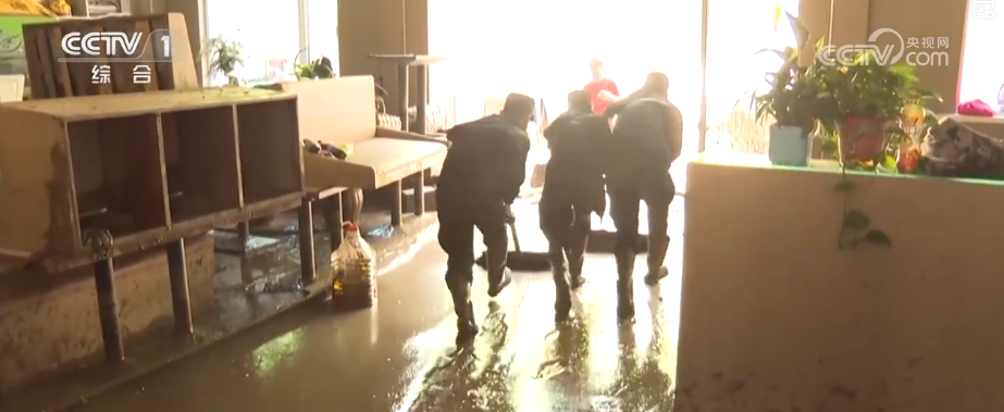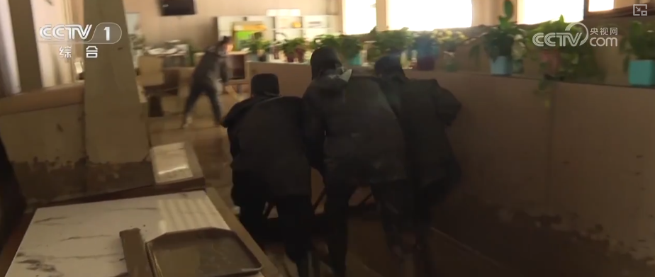在兴隆山游客服务中心旁的这家餐馆里,兰州市公安局特警支队二大队大队长吴国泰正带领着队员,把涌进一楼的泥浆用铁锹和推板铲到门外。