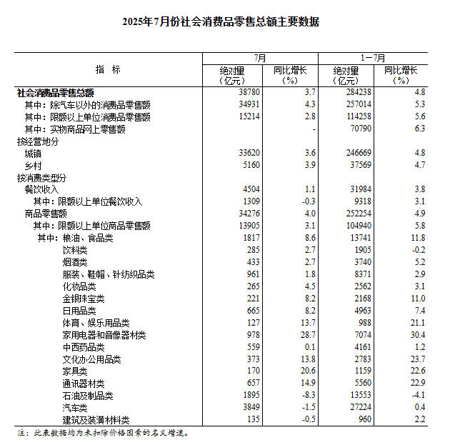 正在阅读:国家统计局:7月份社会消费品零售总额同比增长3.7%