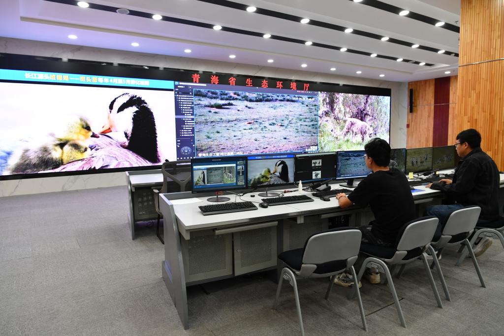 8月8日,青海省生态环境厅信息中心工作人员正在分析野生动物监测画面。(刘红 摄)
