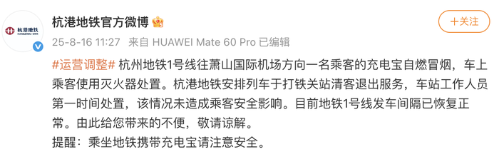 央视网消息:8月16日,@杭港地铁官方微博 发文回应“地铁1号线有乘客发现最后一节车厢传出浓烟”:杭州地铁1号线往萧山国际机场方向一名乘客的充电宝自燃冒烟,车上乘客使用灭火器处置。杭港地铁安排列车于打铁关站清客退出服务,车站工作人员第一时间处置,该情况未造成乘客安全影响。目前地铁1号线发车间隔已恢复正常。由此给您带来的不便,敬请谅解。