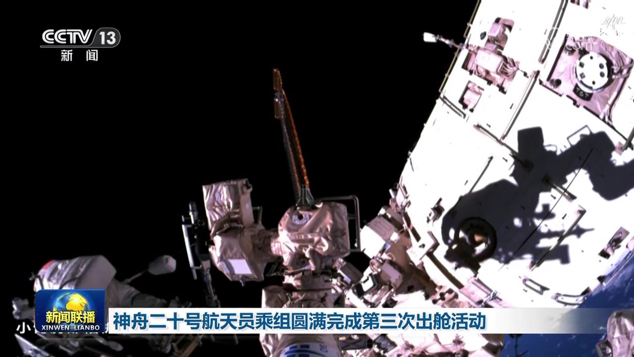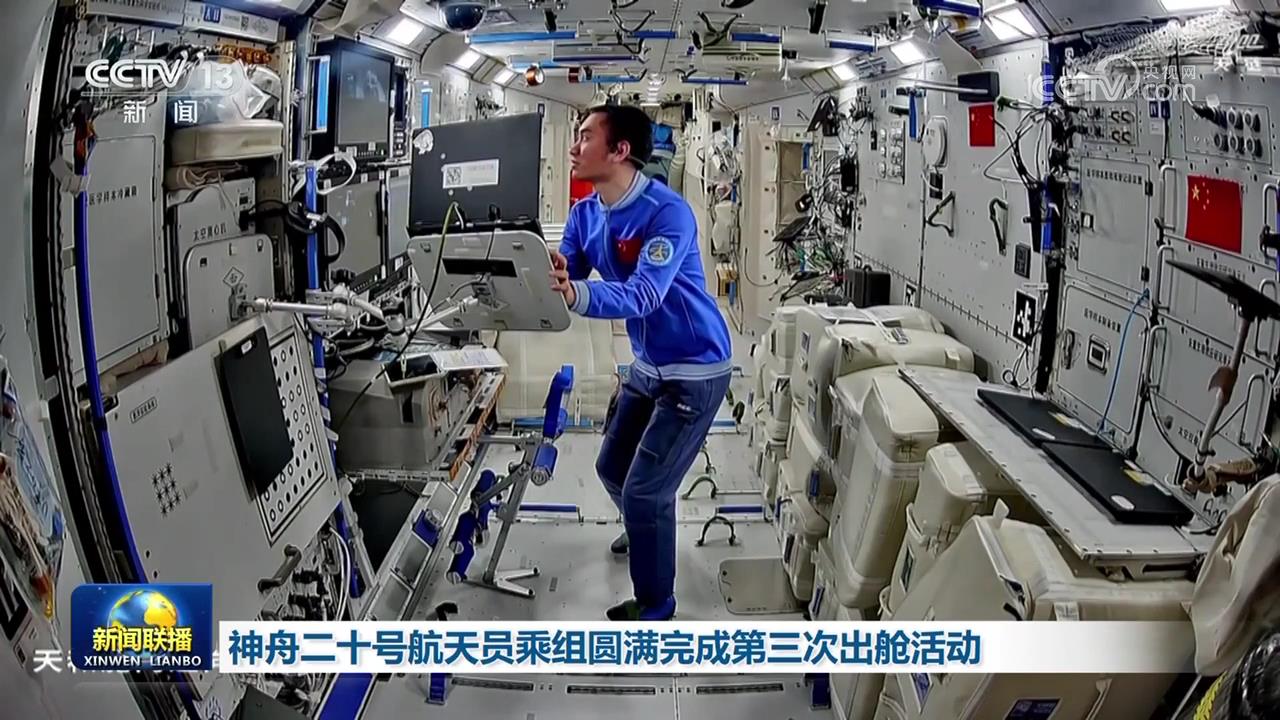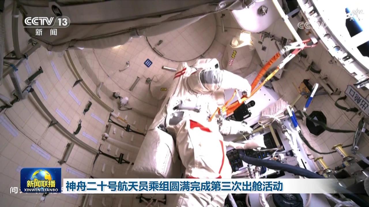 央视网消息(新闻联播):8月15日22时47分,经过约6.5小时的出舱活动,神舟二十号乘组航天员陈冬、陈中瑞、王杰密切协同,在地面科研人员配合支持下,圆满完成第三次出舱任务。
