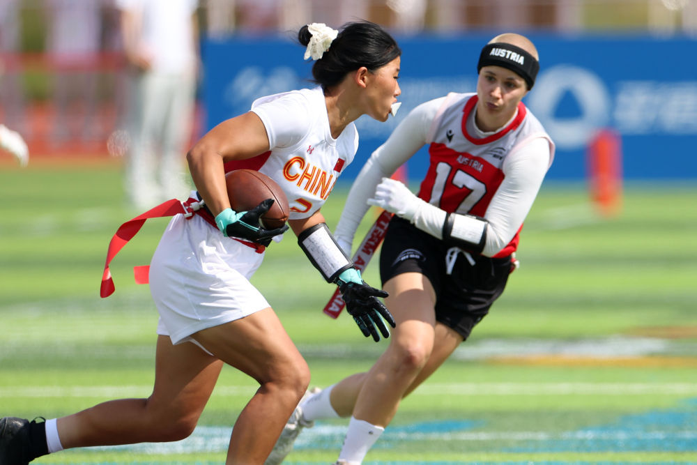 8月14日,在2025年成都世运会腰旗橄榄球女子预赛A组比赛中,中国队45:47不敌奥地利队。图为中国队球员高子旋(左)在比赛中。新华社记者 陈斌 摄
