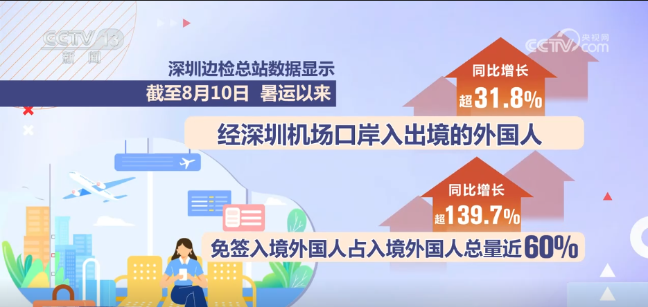 今年暑期,像这样与家人、朋友结伴来中国旅游的外国游客在深圳机场越来越多。深圳边检总站数据显示,截至8月10日,暑运以来,经深圳机场口岸入出境的外国人同比增长超31.8%,免签入境外国人占入境外国人总量近60%,同比增长超139.7%。边检工作人员介绍,很明显的变化就是来华家庭游持续升温,特别是14岁以下儿童和65岁以上年长者这一人群,人员数量同比增长超43.4%。在口岸现场,我们也为60岁(含)以上的人员开通了特别通道,保障快速通关。