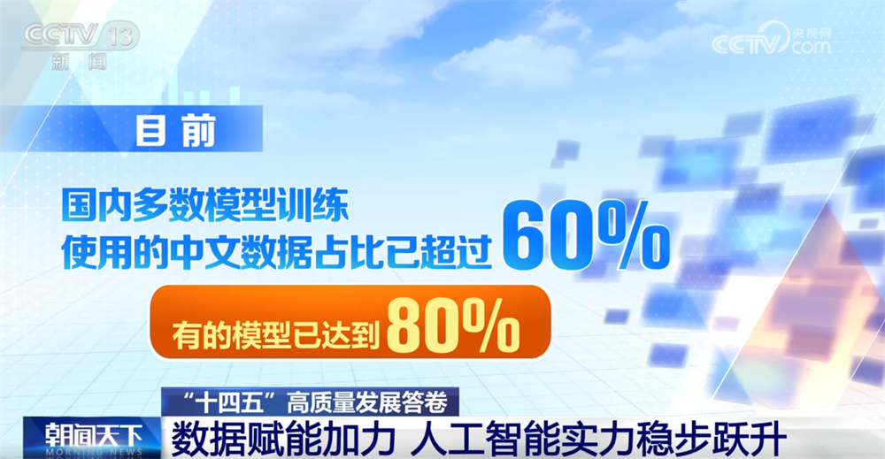目前,国内多数模型训练使用的中文数据占比已超过60%,有的模型已达到80%。中文高质量数据的开发和供给能力持续增强,推动国产人工智能模型性能大步向前迈进。