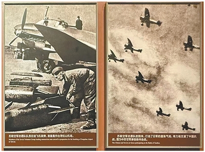 中国人民抗日战争纪念馆中展示的苏联援华航空队老照片。左侧照片为苏联援华航空队成员为飞机装弹,准备轰炸被日军占领的台北松山机场。右侧照片为1938年中苏空军参加徐州会战。