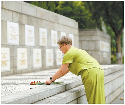 叶莲娜在武汉苏联空军志愿队烈士墓祭奠外祖父舒斯特尔。