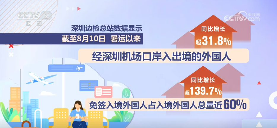 今年暑期,像这样与家人、朋友结伴来中国旅游的外国游客,在深圳机场越来越多。深圳边检总站数据显示,截至8月10日,暑运以来,经深圳机场口岸入出境的外国人同比增长超31.8%,免签入境外国人占入境外国人总量近60%,同比增长超139.7%。