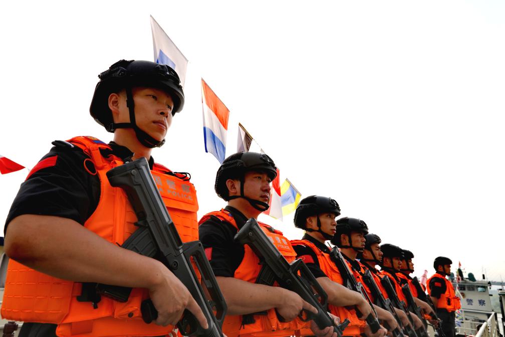 8月19日,西双版纳景哈警务码头,中方执法队员整装列队,等待起航。(云南省公安厅水上巡逻总队供图)