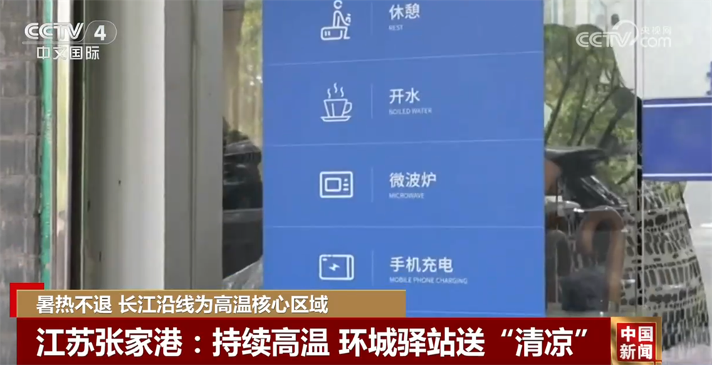 在江苏张家港,城管部门为高温天里的户外工作人员提供了“环城护卫”爱心休息驿。在这里,环卫工人、外卖小哥等户外工作者可以纳凉、充电、饮水和如厕,同时还提供了防暑药品。