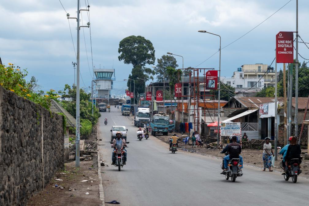 这是5月5日在刚果(金)东部北基伍省戈马市拍摄的市中心街道和远处的机场塔台。新华社记者郑扬子摄