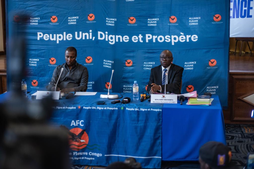 7月3日,刚果(金)反政府武装“M23运动”对话代表姆博宁帕(右)出席在戈马举行的记者会。新华社发(扎内姆·内蒂·扎伊迪摄)