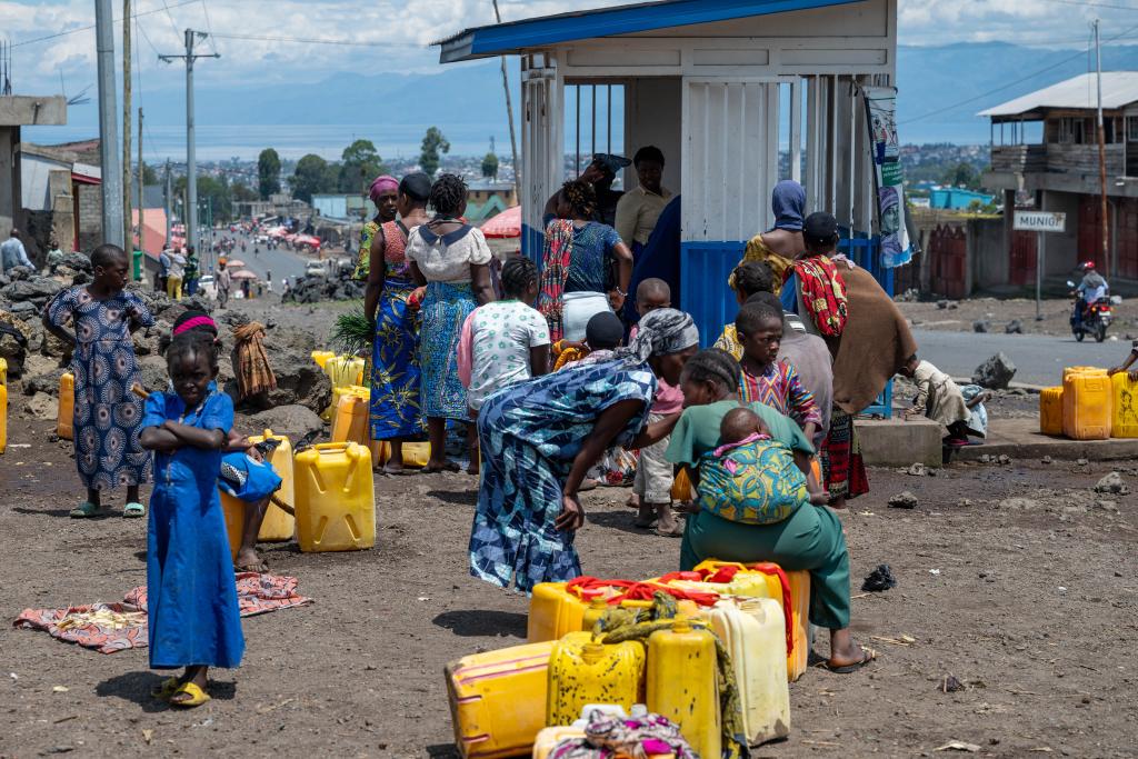 5月6日,在刚果(金)东部北基伍省戈马市郊,流离失所者在原营地附近的一处取水点等待取水。新华社记者郑扬子摄