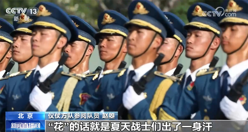 仪仗方队参阅队员赵曌称:“仪仗兵有自己的‘风花雪月’,我们的‘风’是踢腿带风;‘花’是夏天战士们出了一身汗凝结成的汗碱花;‘雪’的话就是冬天,我们之前有一张照片,男兵头上在滴汗,因为天气很冷的缘故结成了一条冰棱;‘月’就是指我们每天晚上的夜训,月亮在空中照着,我们在操场上训练着。”