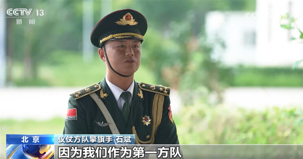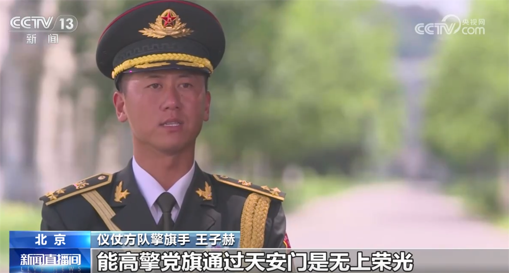仪仗方队擎旗手王子赫称:“作为一名党员,能高擎党旗通过天安门是无上荣光,更是千钧重任,我的爷爷、太姥爷都参加过抗日战争,我更加知道这面旗的分量,我想让他们看到中国军队新时代的风采,中国军队永葆本色、奋勇向前的状态。”