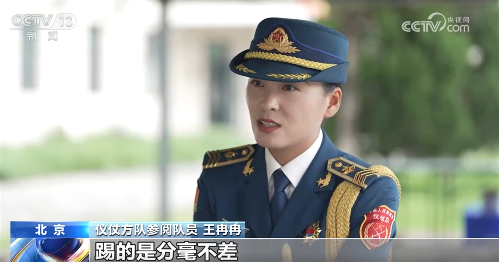 仪仗方队参阅队员王冉冉称:“一步75厘米,你不能是77厘米,你也不能是74厘米,每一步就要75厘米,重复是在重复什么,重复的就是标准,就要达成标准。可能有些人不太理解,那一动又一动是在踢什么,踢的就是速度、踢的是力度、踢的是标准、踢的是分毫不差。”