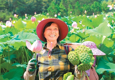 不久前,在江西省吉安市泰和县冠朝镇宏冈村生态莲子种植基地,农民正在采摘莲蓬。邓和平摄(人民视觉)
