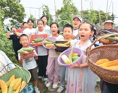 近日,江苏省扬州市江都区郭村镇周楼小学的孩子们在家长的陪伴下,正在校园“忆苦思甜”农场内展示自己采摘的苦瓜。庄文斌摄(人民视觉)