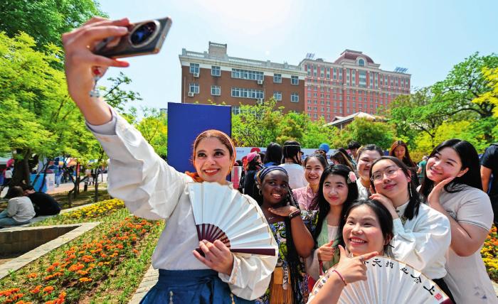 中外青年在以“上合之约天外同彩”为主题的天津外国语大学第八届国际文化节上合影留念(2025 年 4 月 20 日摄)孙凡越摄 / 本刊