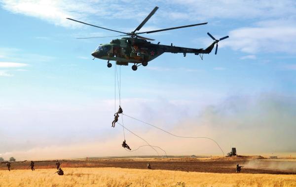 在俄罗斯奥伦堡州东古兹靶场举行的“和平使命-2021”上海合作组织联合反恐军事演习实兵实弹演习中,多国联合部队特战分队执行索降作战任务(资料照片)梅世雄摄 / 本刊