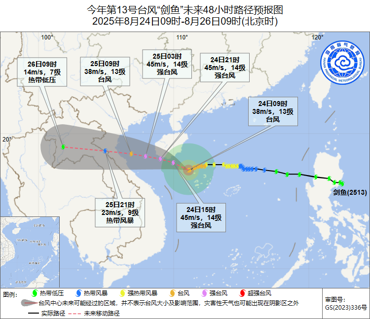 央视网消息:据“海南气象”微信公众号消息,海南省政府2025年08月24日09时40分提升台风二级预警为台风一级预警:台风“剑鱼”(台风级),09时中心位于北纬17.3度、东经111.1度,也就是在离三亚市东偏南方向约200公里的南海海面上,中心附近最大风力有13级(38米/秒),七级风圈半径200~220公里,十级风圈半径80公里,十二级风圈半径40公里。