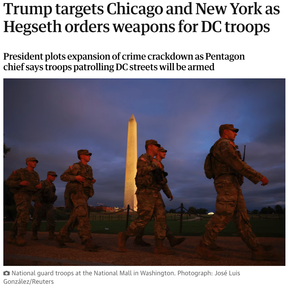 △《卫报》报道,特朗普表示不排除宣布进入国家紧急状态的可能,并点名芝加哥和纽约“一片混乱”,表示芝加哥是下一个目标。