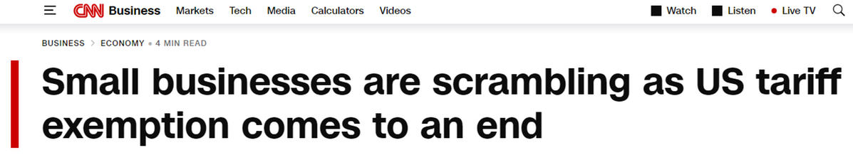美国有线电视新闻网(CNN)报道指出,国际邮政服务暂停向美国发货,是特朗普政府全面贸易政策冲击美国普通消费者和小企业的又一例证。