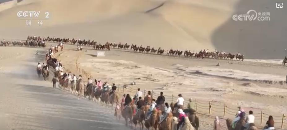 暑期甘肃敦煌旅游异常火爆,每天有上千峰骆驼在鸣沙山月牙泉景区接待游客,为此景区内的骆驼也开启了“朝五晚九”的忙碌工作模式。