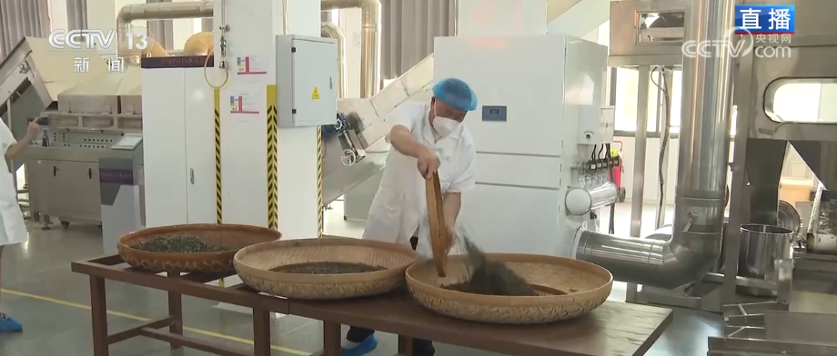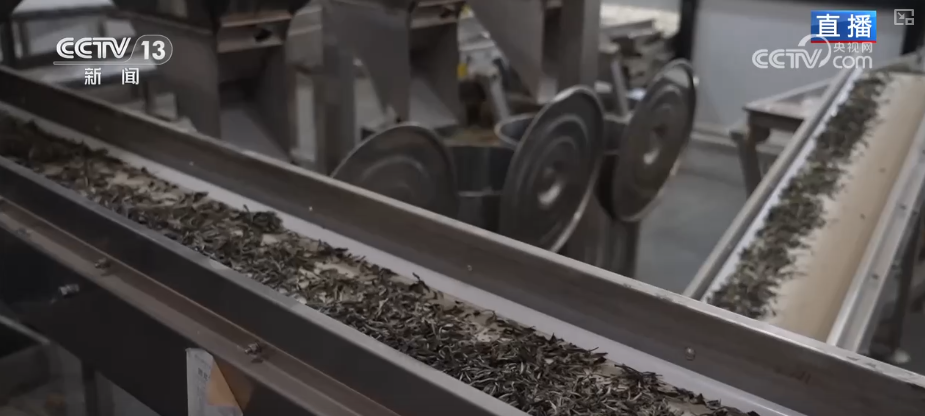 和传统的工艺有一些相似,风选机会把茶叶吹起来,重量较大的合格茶叶会落到下方的传送带中,而轻的碎末会被吹倒更远的槽中。林振传介绍,人工筛茶这个步骤,风选机一天的量需要20个工人做上一整天。