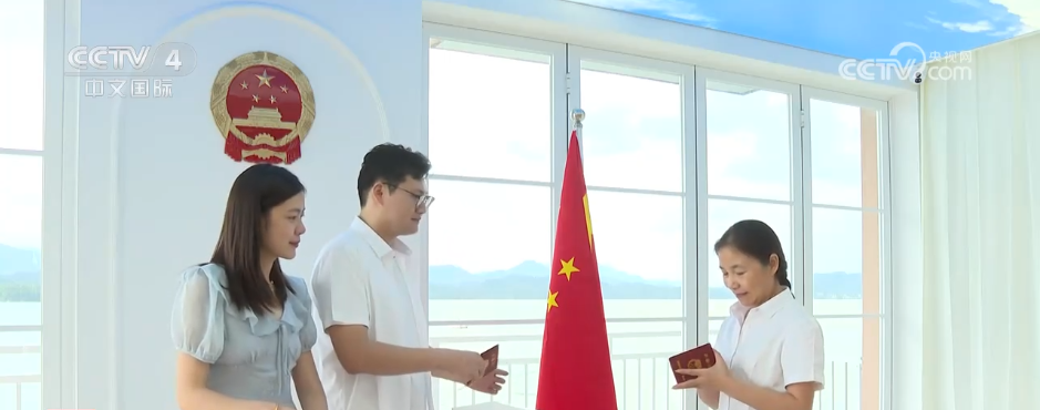 29日,浙江千岛湖镇月光岛婚姻登记中心正式运行。两位新人在这里办理了结婚登记,在温馨的宣誓仪式中,工作人员将证书交到新人手中。千岛湖景区推出多项优惠,新人们在这里可以享受酒店住宿、景点游览折扣,还能乘坐专门开通的 “爱情渡船”往返月光岛。