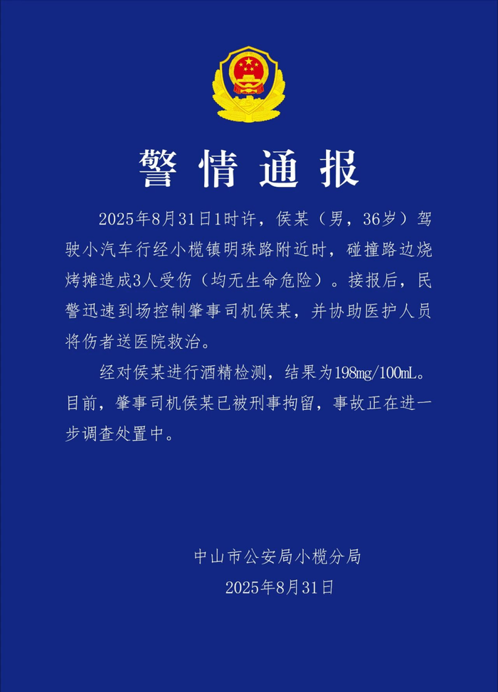 央视网消息:广东中山市公安局小榄分局8月31日发布警情通报:2025年8月31日1时许,侯某(男,36岁)驾驶小汽车行经小榄镇明珠路附近时,碰撞路边烧烤摊造成3人受伤(均无生命危险)。接报后,民警迅速到场控制肇事司机侯某,并协助医护人员将伤者送医院救治。经对侯某进行酒精检测,结果为198mg/100mL。目前,肇事司机侯某已被刑事拘留,事故正在进一步调查处置中。