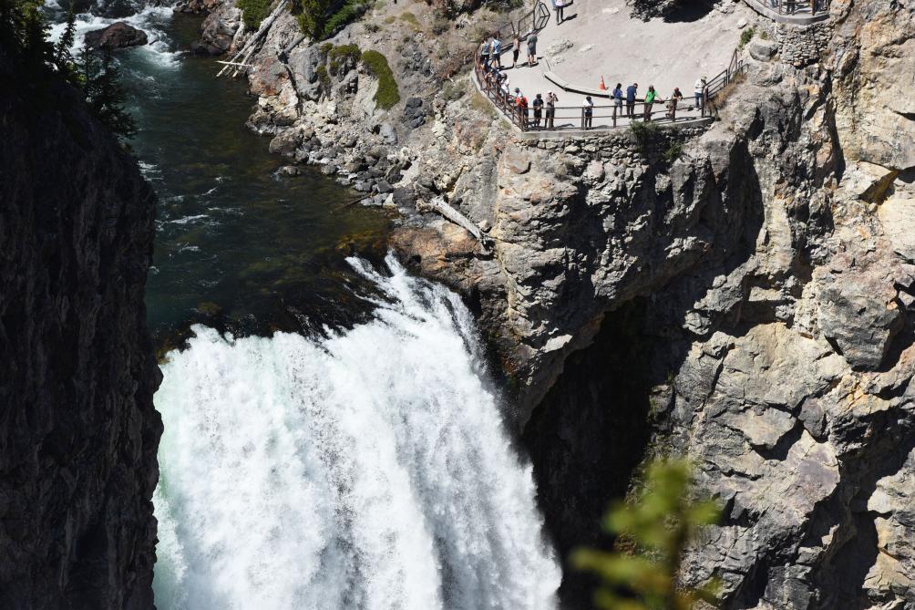 2019年9月3日,游客在美国黄石国家公园观赏下瀑布。新华社记者韩芳摄