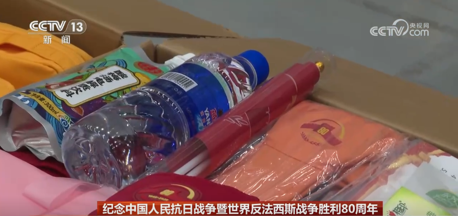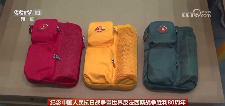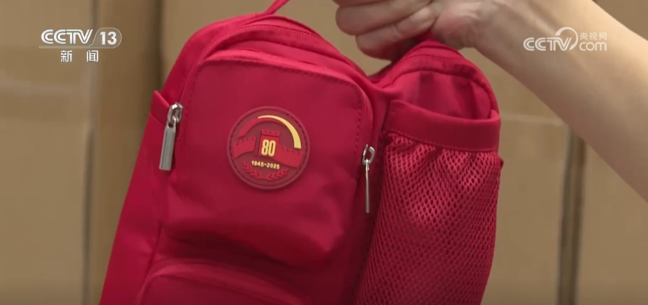 记者现在是在观礼人员服务包的存储仓库注意到,这些服务包已经被装载完毕,静待发车。先来了解一下服务包的外部设计特点和使用功能。它上面有一个小口袋,可以装风油精和纸巾,下面还有一个小口袋,可以装背包袋,旁边的网兜,可以装水瓶或者水壶。它能够基本满足广场上观礼群众当天的保障需求,而这三个小口袋就构成了“80”字样,契合今年抗战胜利80周年的主题。