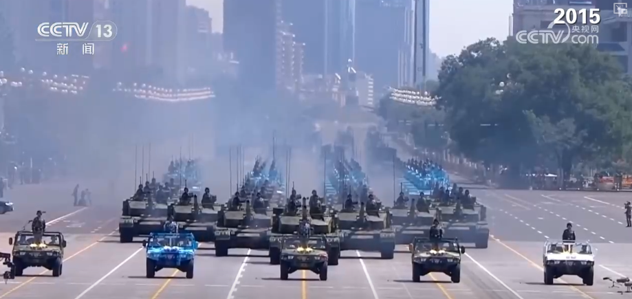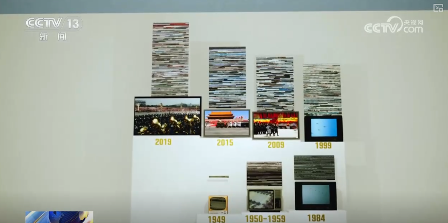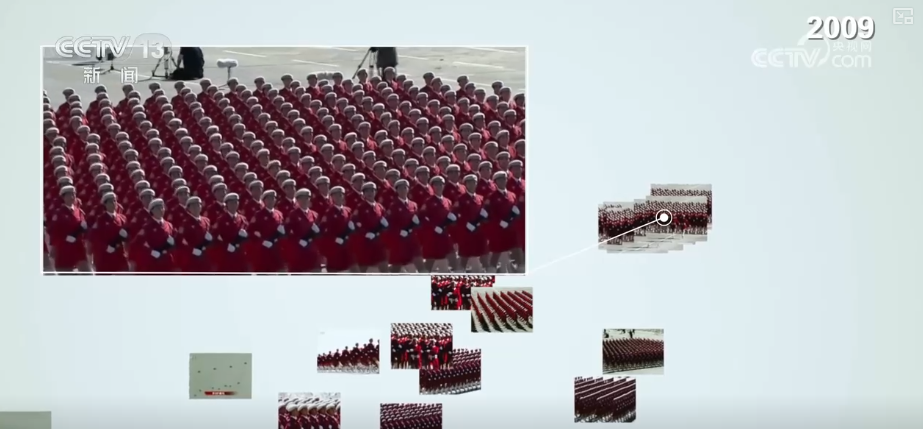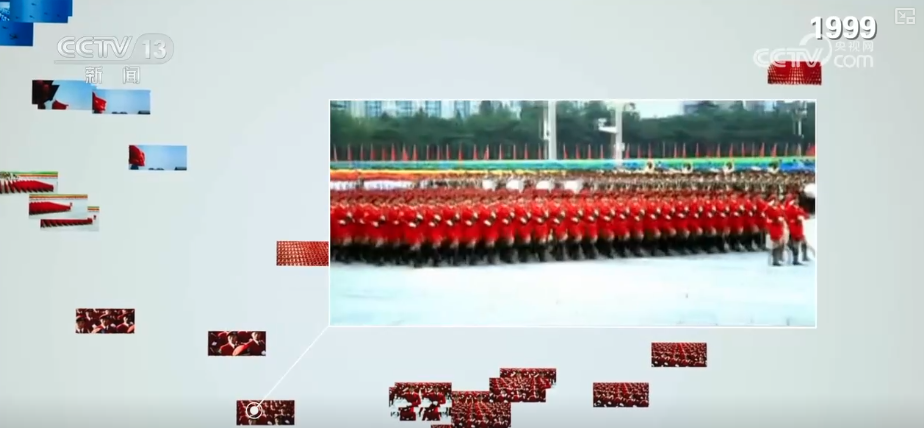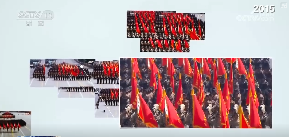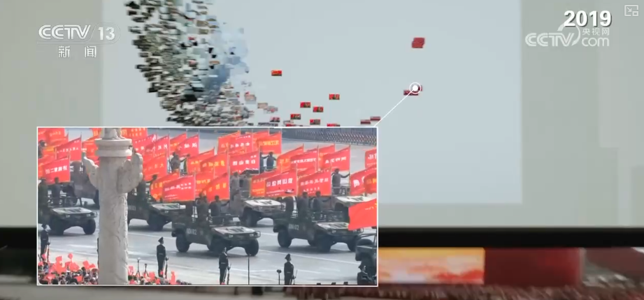 那我们为什么需要这样的展示,在这些“蚊香图”中,我还想和你分享最后一个彩蛋。不知道你有没有注意到这些图里的红色,1999年、2009年的红色是民兵方队,提醒我们抗战胜利不只属于军人,还有那些推着“小推车”上战场,为前线提供物资的普通百姓。2015年那抹红,是抗战部队番号旗和荣誉旗,抗战英模部队的名字走上长安街。2019年的红色,来自100面荣誉功勋部队旗帜,每一抹红色都是荣誉与胜利,也纪念着无数先烈的血与泪。