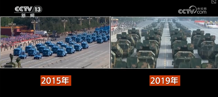 不过,颜色里还有一个“反常现象”,前面我们说到,这些年蓝色画面逐渐增多,可在武器装备方队里反而减少了。尤其是2019年,岸舰导弹方队不再是蓝色而是林地迷彩,更适合陆上作战的隐蔽性。我们阅兵模块编组的体系作战趋势,不是概念而是完全以实战为导向。今天在阅兵,明天若祖国需要就能直接上阵。