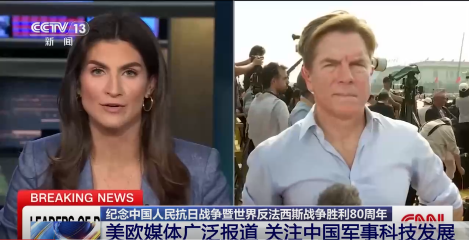 美国有线电视新闻网(CNN)通过现场记者和总台的直播信号几乎全程关注了抗战胜利80周年纪念大会。美国广播公司(ABC)、美国全国广播公司(NBC)、美联社等多家媒体和通讯社也对此进行了转播和报道。