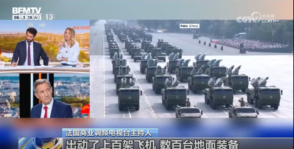 当法国商业调频电视台主持人提问空军上将帕特里克·迪塔尔特时,这次阅兵动用上万人,出动了上百架飞机、数百台地面装备,还有很多先进武器,有什么给他留下深刻印象?帕特里克·迪塔尔特说,这次阅兵涵盖了现代中国军队的各个领域,并且所有受阅装备均为自主研发。