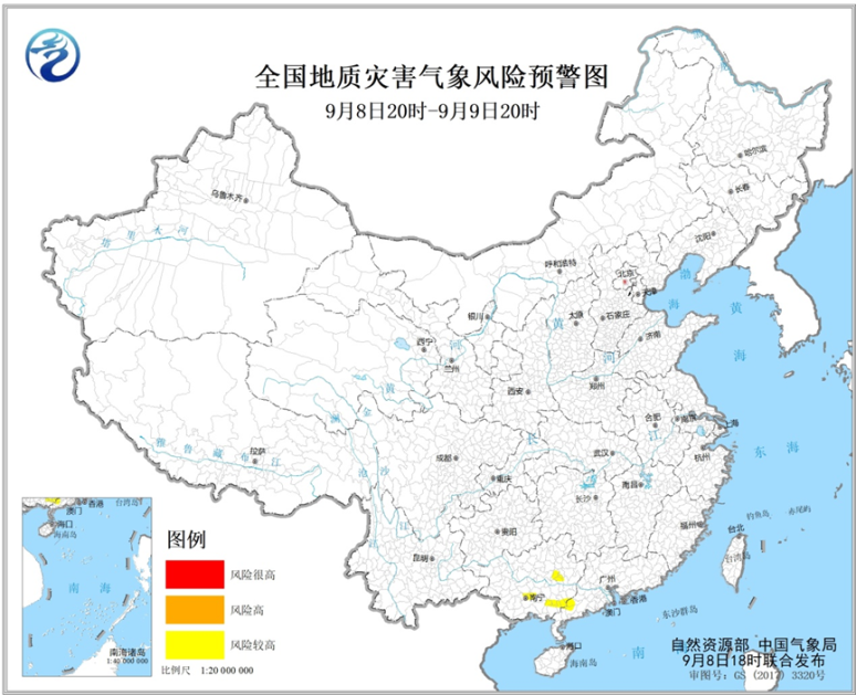 央视网消息:自然资源部与中国气象局9月8日18时联合发布地质灾害气象风险预警:预计,9月8日20时至9日20时,广东西南部、广西中东部等地部分地区发生地质灾害的气象风险较高(黄色预警)。各级政府及有关部门按照应急预案做好地质灾害防御工作。请社会公众及时关注地质灾害气象风险预警信息,谨慎前往地质灾害预警区域。黄色预警区内人员,请随时关注预警信息变化,注意附近警示标志,避免在沟谷、斜坡、陡崖(坎)等高风险地带逗留。