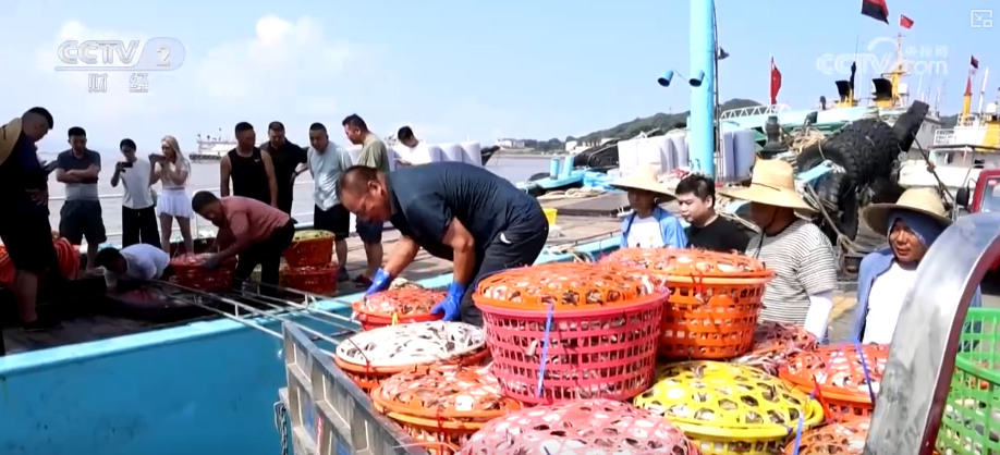 在舟山国际水产城的码头,工作人员介绍,自梭子蟹开捕以来,码头每天都要迎来近百艘捕捞梭子蟹的渔船。