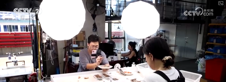 在距离码头不远的电商产业园里,主播们正售卖新鲜上市的梭子蟹。为了缩短发货时间,这家店铺在直播的同时打包海鲜,即买即发,每天可以发出六到七百个订单。