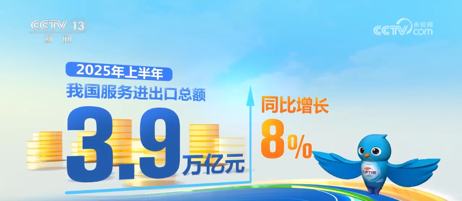 今年上半年,我国服务进出口总额3.9万亿元,同比增长8%,规模创历史同期新高。其中服务出口1.7万亿元,增长15%。