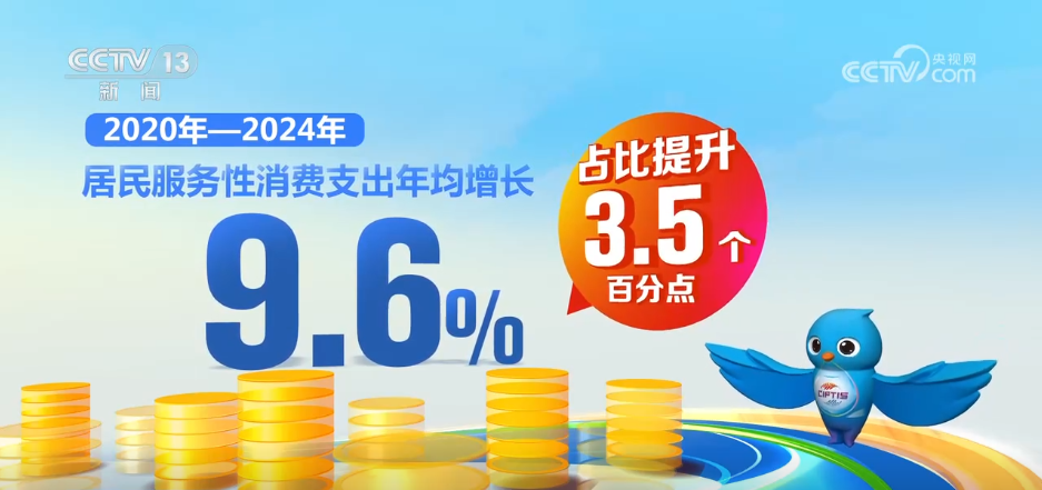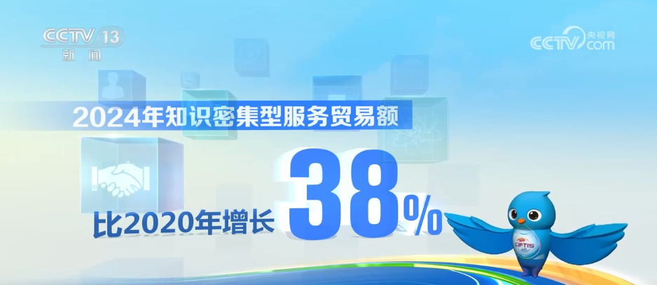 “十四五”期间,我国服务消费进入快速增长阶段,2020—2024年,居民服务性消费支出年均增长9.6%,占比提升3.5个百分点,达到46.1%。我国首次在全国范围对跨境服务贸易实施负面清单管理制度,2024年知识密集型服务贸易额比2020年增长38%。2024年可数字化交付的服务进出口额比2020年增长近四成。