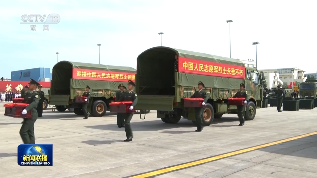 礼兵战士护送志愿军烈士遗骸棺椁及遗物登上军用卡车,在骑警护卫车队引领下,前往沈阳抗美援朝烈士陵园。