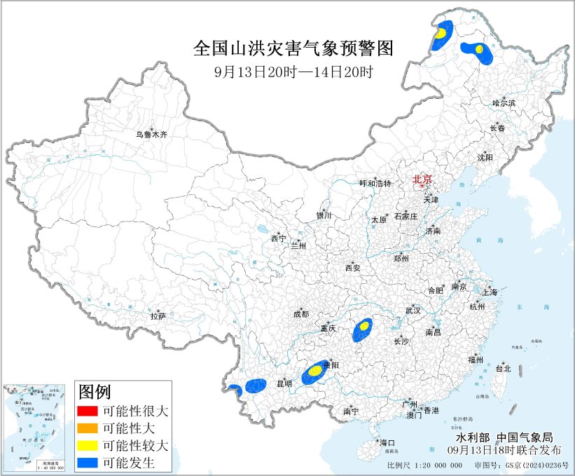 央视网消息:水利部和中国气象局9月13日18时联合发布黄色山洪灾害气象预警:预计,9月13日20时至14日20时,内蒙古东北部、黑龙江西部、湖北西南部、湖南西北部、广西西部、重庆东南部、贵州西南部和东北部、云南东部和西部等地部分地区可能发生山洪灾害(蓝色预警),其中,内蒙古东北部、黑龙江西部、湖南西北部、贵州西南部局地发生山洪灾害可能性较大(黄色预警)。其他地区也可能因局地短历时强降水引发山洪灾害,请各地注意做好实时监测、防汛预警和转移避险等防范工作。