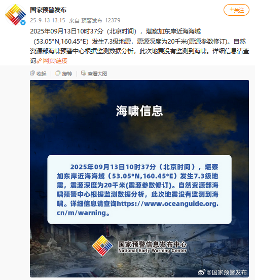 央视网消息:9月13日10时37分(北京时间),堪察加东岸近海海域(53.05°N,160.45°E)发生7.3级地震,震源深度为20千米(震源参数修订)。自然资源部海啸预警中心根据监测数据分析,此次地震没有监测到海啸。
