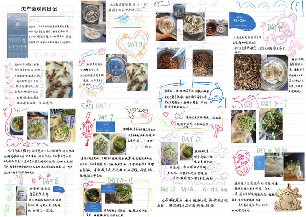 来自青海的杜菲承认自己有些内向,喜欢和动植物相处,录取的专业正合心意。暑假作业,她选择完成园艺学院制定的“一粒种子的力量”实践任务。“作为园艺学子的专业初体验,选择一种本地常见作物,从播种或移栽开始,记录其生长过程,含浇水、施肥、应对天气变化等管理细节。”她选择种植家乡生长的矢车菊,记录种子萌发、幼芽生长的过程。到9月3日这天,“根系在纸巾层中伸展,连生长都变得亮晶晶”。观察记录中,她突然意识到这份作业的特殊意义:自己遇到任何问题都能通过网络查到数据,比如植物的适宜温度、喜好,“但老一辈要解决这个问题,可能需要很多次实验,一直去探索合适的温度”。