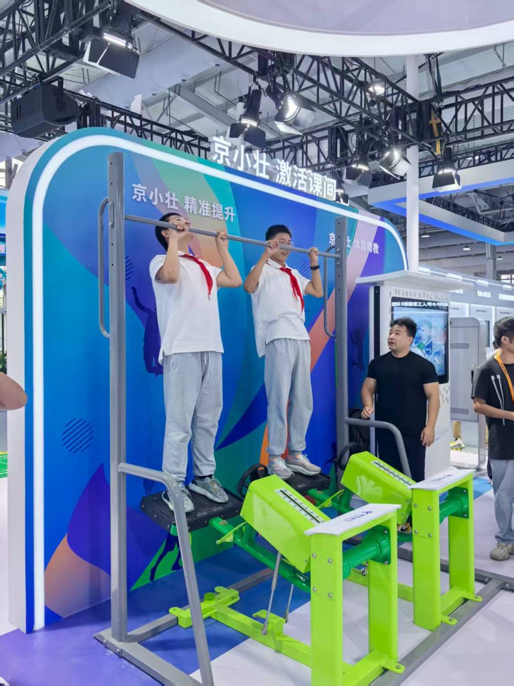 9月10日,学生在2025年服贸会教育服务专题展馆体验“京小壮”引体向上器械。新华社记者郁琼源 摄