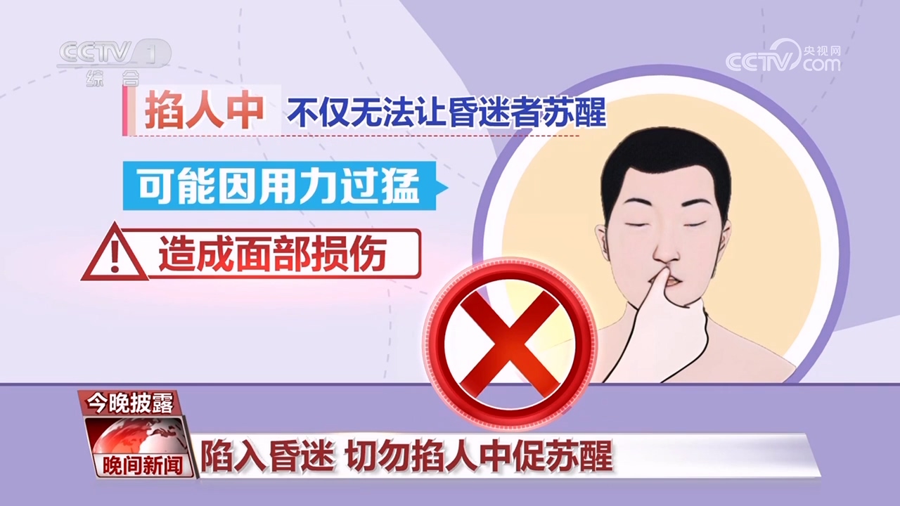 民间还有“昏迷时掐人中”的做法,也是错误的。掐人中,不仅无法让昏迷者苏醒,还可能因用力过猛,造成面部损伤。正确做法是先判断患者的呼吸、心跳,一旦发现呼吸心跳停止,立即进行心肺复苏。